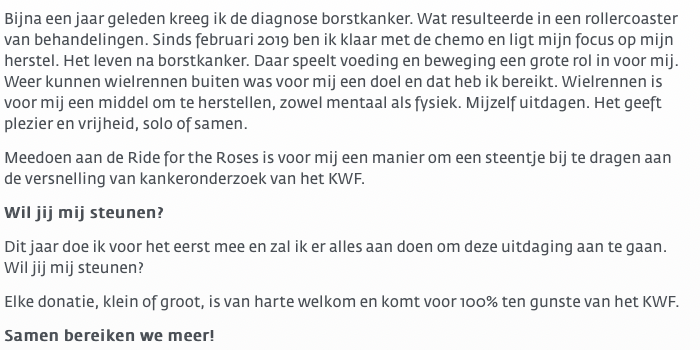Ik had een persoonlijke actiepagina aangemaakt op de website van de Ride for the Roses 2019. Op deze pagina vertelde ik waarom ik meedeed.
